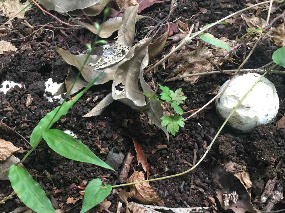 今年はもう終わりと思っていたタマゴダケ。何段階かの姿が一緒に見られたので成長の様子を5連続で投稿します。5枚のうちの①土から誕生