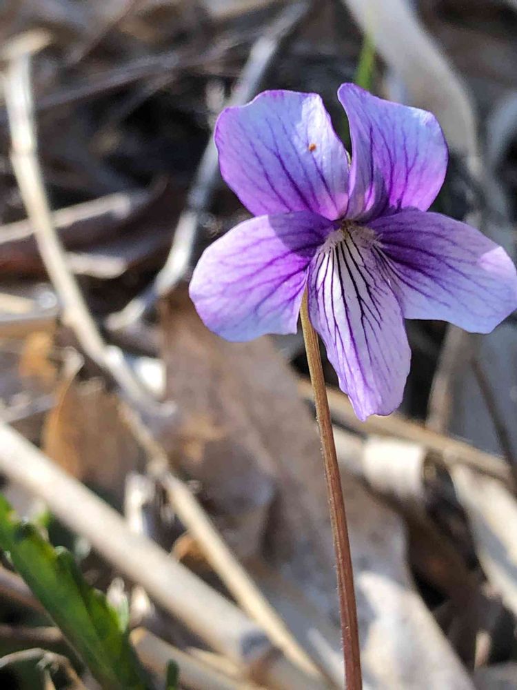 花びらの色は、ホンスミレよりやや薄紫で、ピンク色が混じっています。