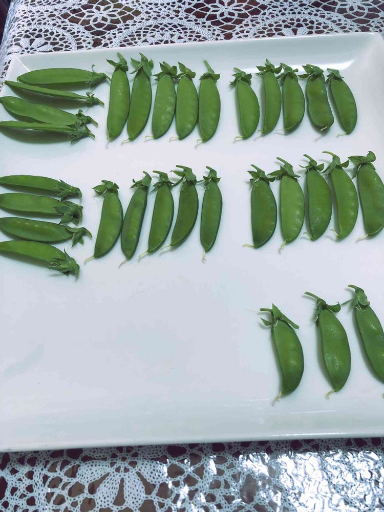 2021-3-27(土)晴れ☀️ 今日の収穫サヤエンドウ 6cmサイズ14枚 5cmサイズ14日 中の豆が丸くなったサヤ 3枚