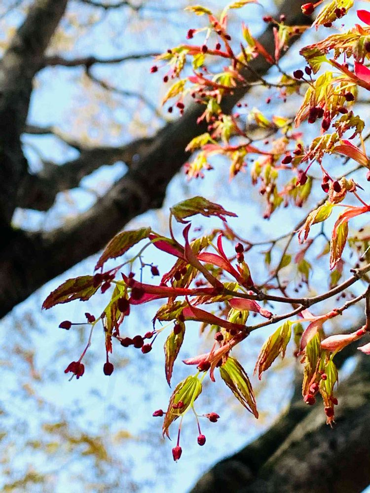 葉はカエデかモミジかよくわかりませんが同属だし🍁いずれも新緑の頃小さな赤色の花が咲きますよね😃みどり一色の新緑の森では目につきますよ!