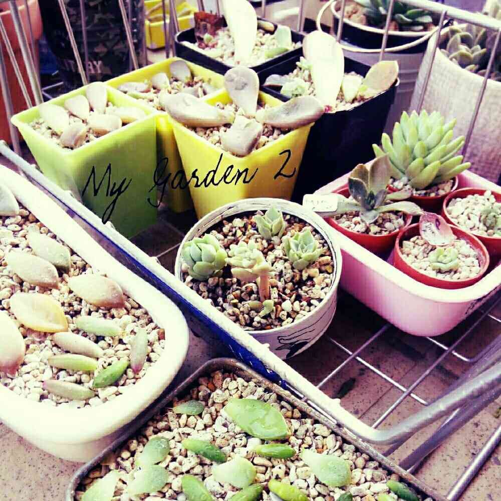 ミニサボが占領してる庭の1角が多肉置き場だけどその中の半分が葉挿しです。さっきまた外にでて使ってなかった鉢を出してポイポイトレーから葉っぱを取り出して並べて霧吹きして戻ってきました!