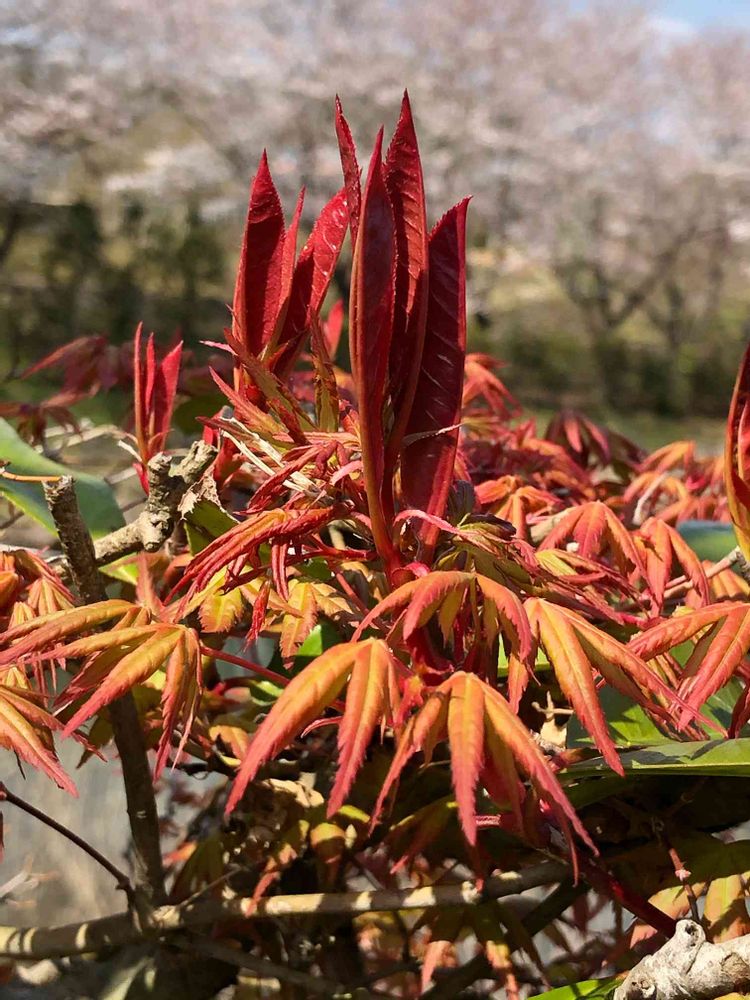 今回はちょっと趣向を変えて「クイズ」です。タイトルは「新芽のコラボ」、桜をバックに2種類の新芽が映っています。一つは比較的分かりやすいと思いますが、もう一つは何でしょう❓