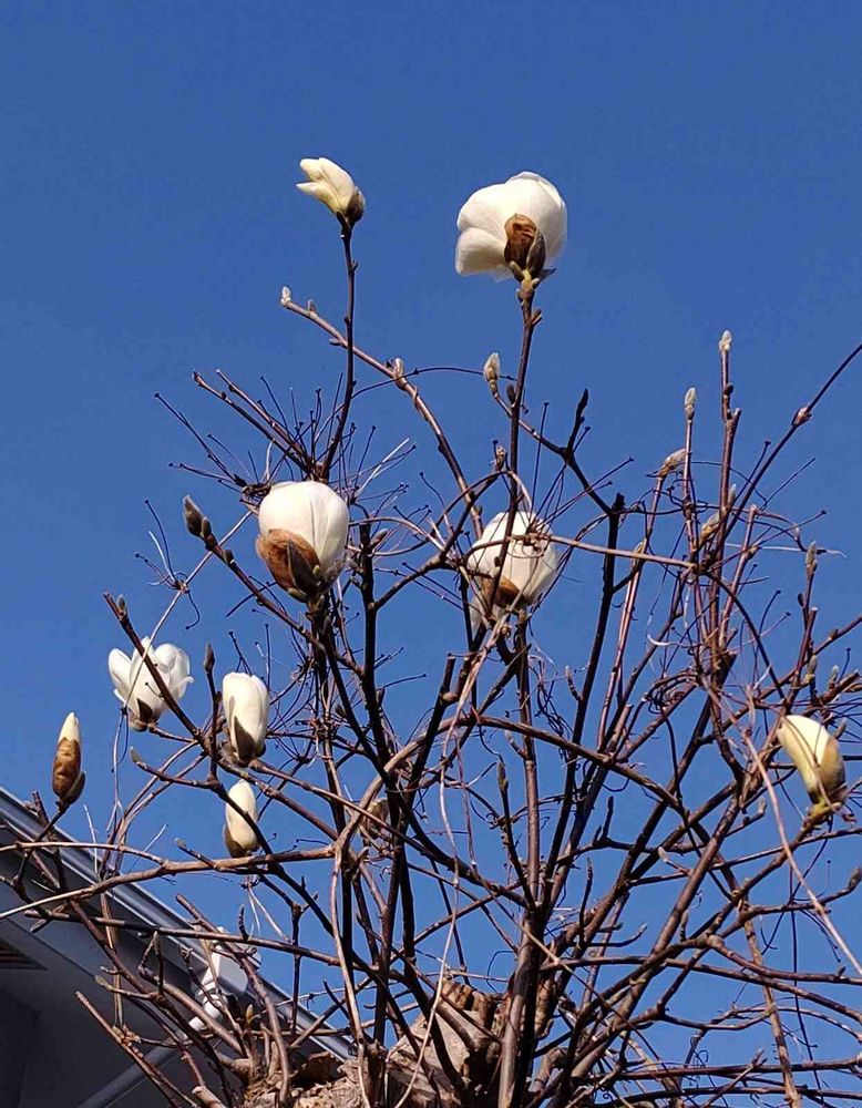 ハクモクレン青空に冴えますね。ハクモクレンは北の方向いて咲くそうですが、北向いていますか?