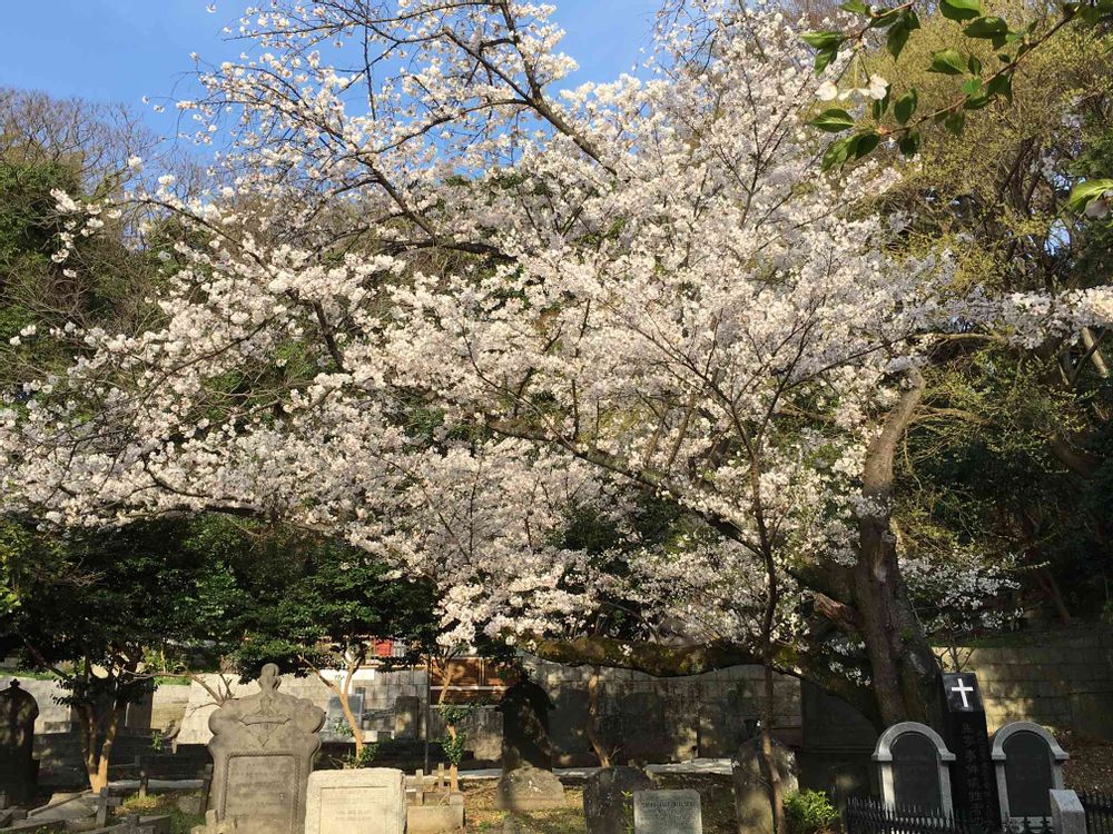 今日、横浜外人墓地の桜🌸が満開になりました。きれいです。人もたくさん出てますので、ちょっと心配ですね。