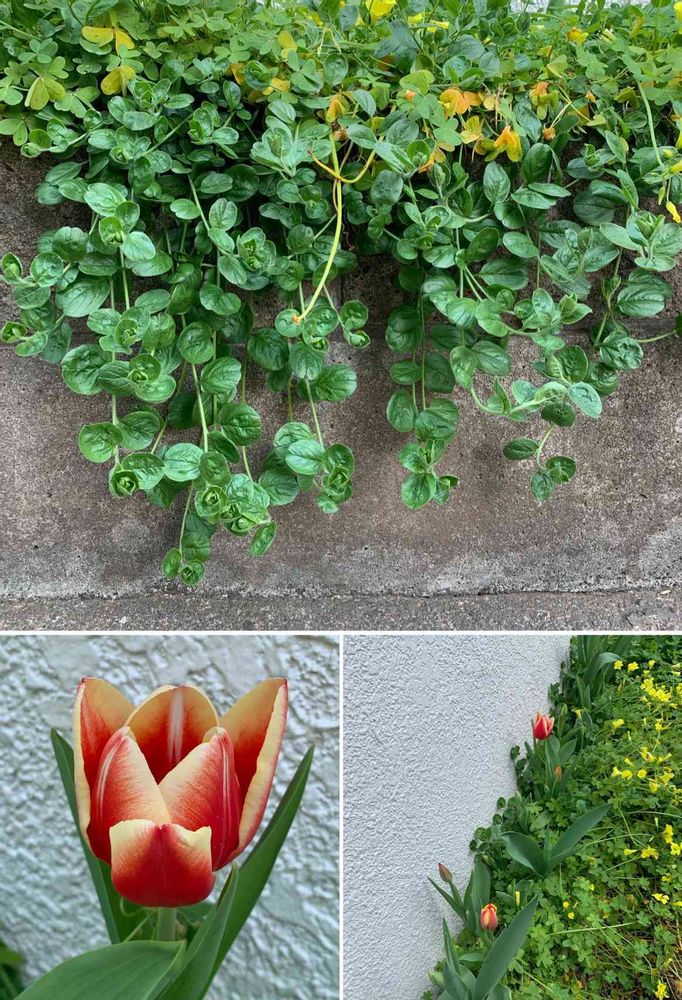 コンボルブルスとオキザリスの植わっている壁際に仕込んだ2色咲きミックスのチューリップ🌷も1つ目が開花です✨