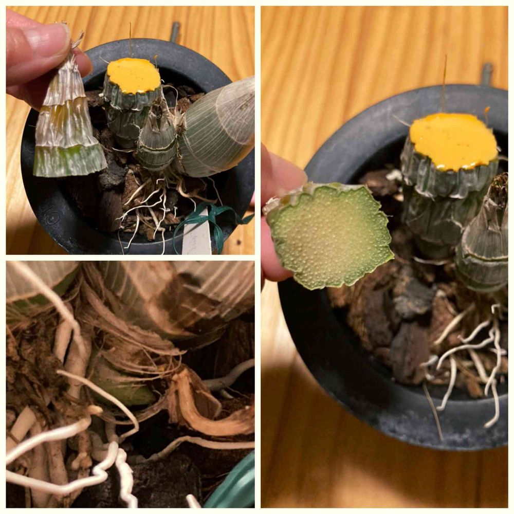 今朝、水を絶っているルッセリアナの古いバルブの先端の色が変なのに気付きました😨触るとちょっと柔らかい⁇