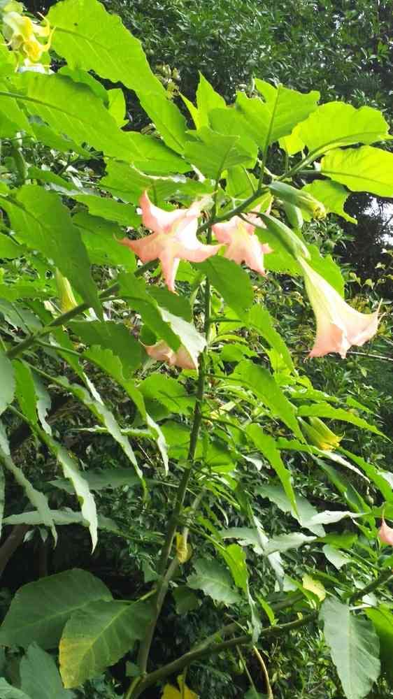 このユリのような、大きな昼顔のようなお花、何て名前ですか?教えてくださいませ~🍀⬅️「エンジェルストランペット(ダチュラ、コダチ(キダチ)チョウセンアサガオ)」ですね❗️教えて頂きありがとうございます🎵