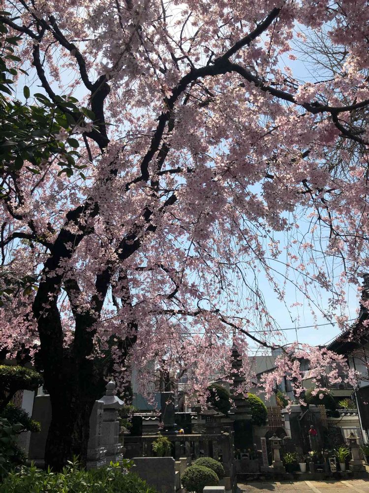 お寺に行ったら、枝垂れ桜がシャワーのように降り注いでいて、圧巻でした。