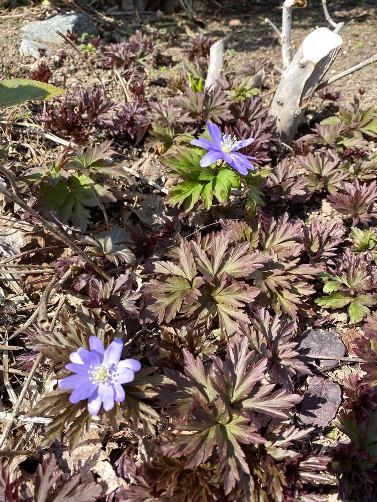 暖かくなると、紫と白の菊咲一華と福寿草が真っ先に咲きます〜春ですね❣