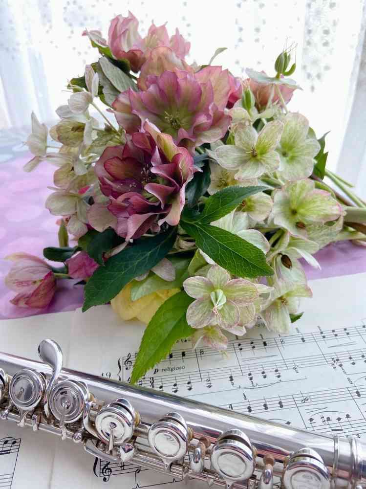 お庭のクリローさんの花束💐とフルートに楽譜、とっても素晴らしいです😍
