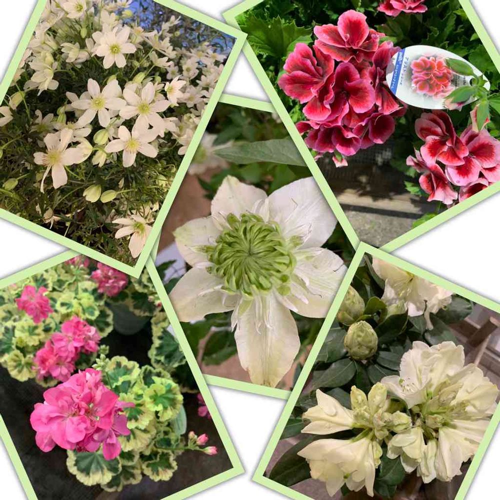 おはようございます⛅️ 出先の園芸店で常緑クレマチス、アリスト、斑入りゼラニウム、西洋シャクナゲ、クレマチス白万重、見惚れてパチリです🌸🌼🌸🌼😻💕