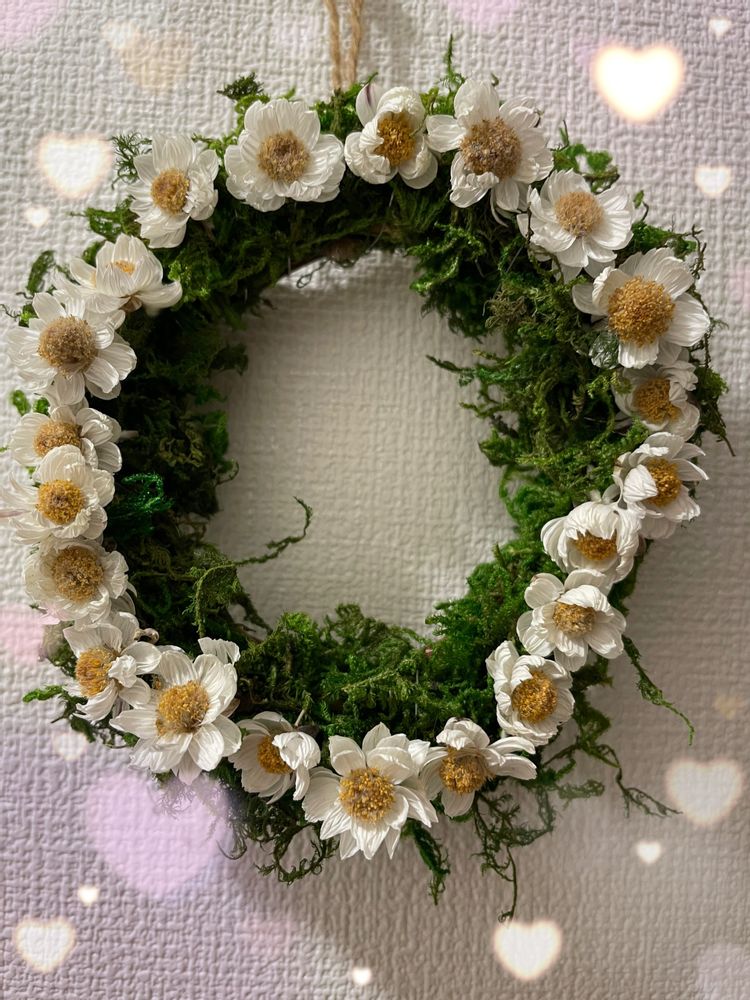 リース台に100均のモスを取り付けその上から花かんざしを貼り付けました🤍💚