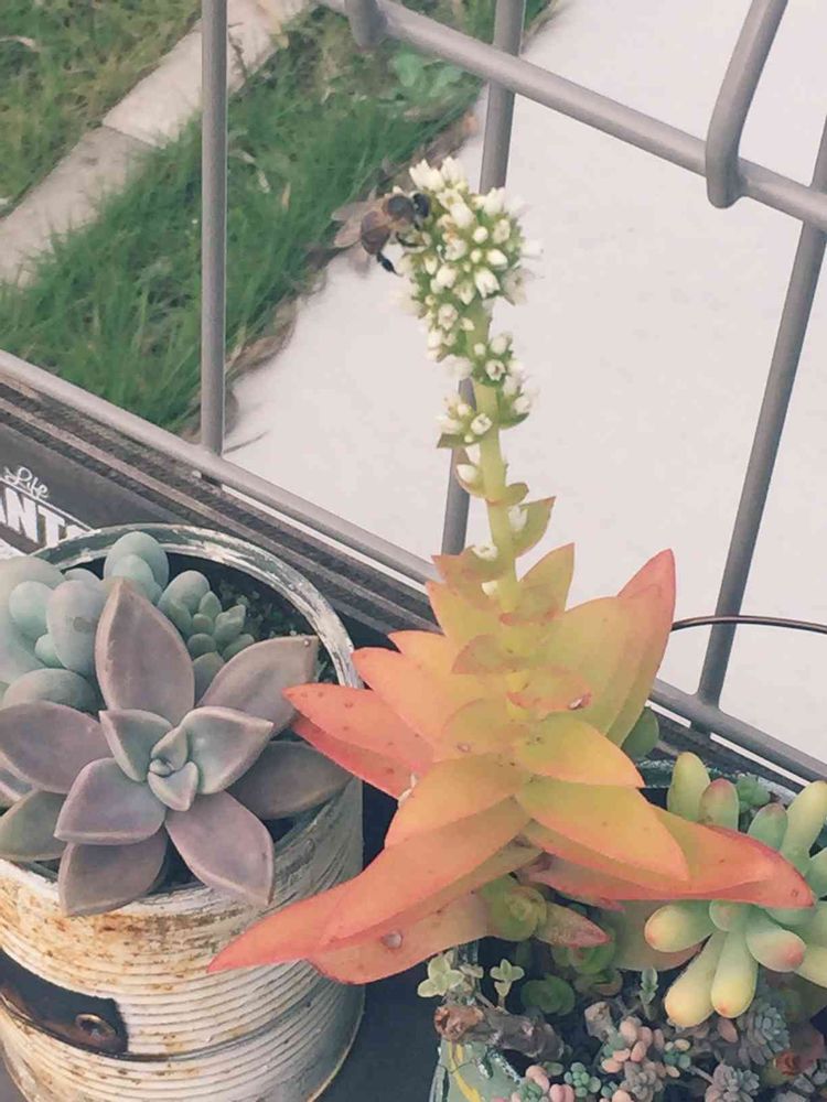 にょきにょきの多肉さんに花が咲いて、蜂がとまってました🌼