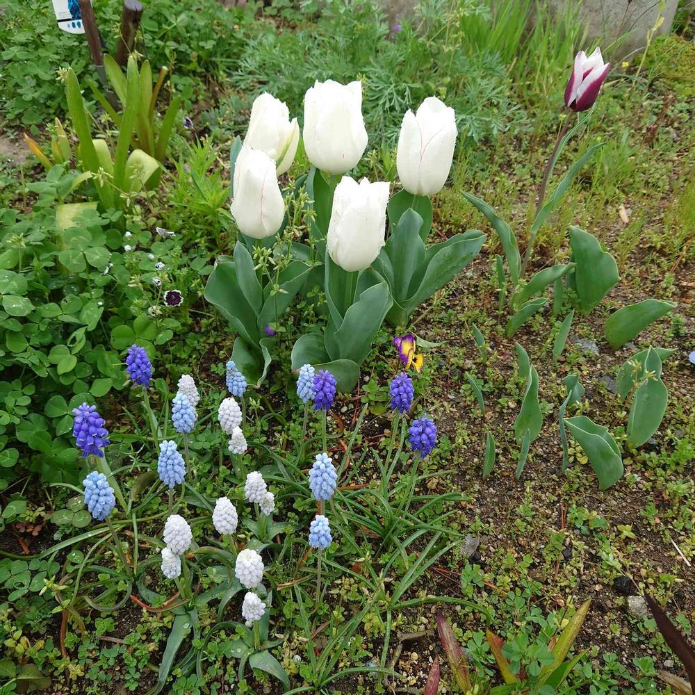 白にうっすら赤色のふちどりが入るチューリップ、ダイヤモンドジュビリー。右奥に咲くチューリップはスピッツベルゲン。これは去年の球根なので、花は小さめ。光合成、頑張れっ。ムスカリも群生させましたがまだまだ少ない…。ヒヤシンスは、水耕栽培でしたが、来年のために土に植えました。