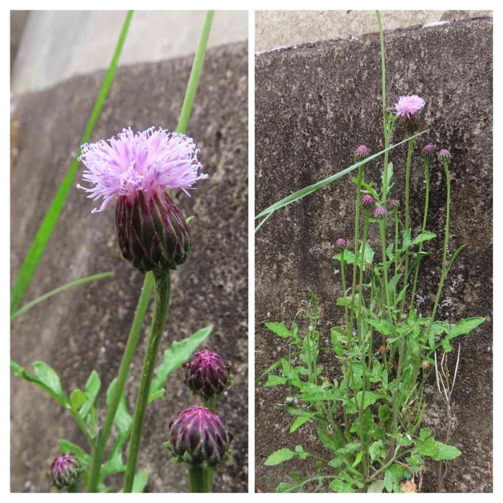 キク科キツネアザミ属の2年草。道ばたや空き地などに生える雑草。 和名は、花がアザミに似ているが、アザミではないことから。
