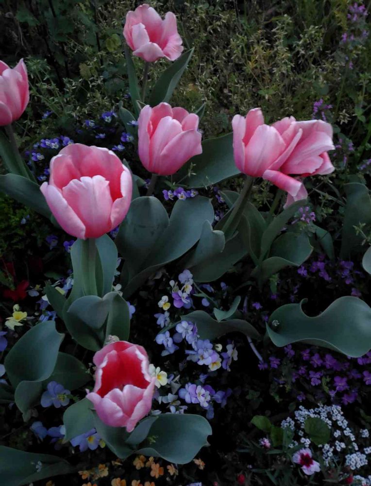 ピンクのチューリップ 花が手のひらくらい大きかった… ビオラが見えにくくなってます!
