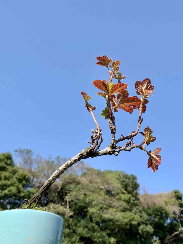 素晴らしい青空に向かって赤い新芽が引き立ちますネェ♪