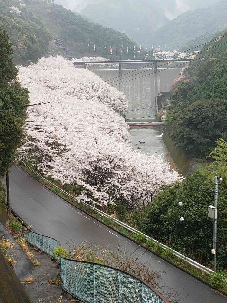 桜とダムに掛かる鯉のぼりのコラボw全体写すのに鯉のぼりが遠い~w