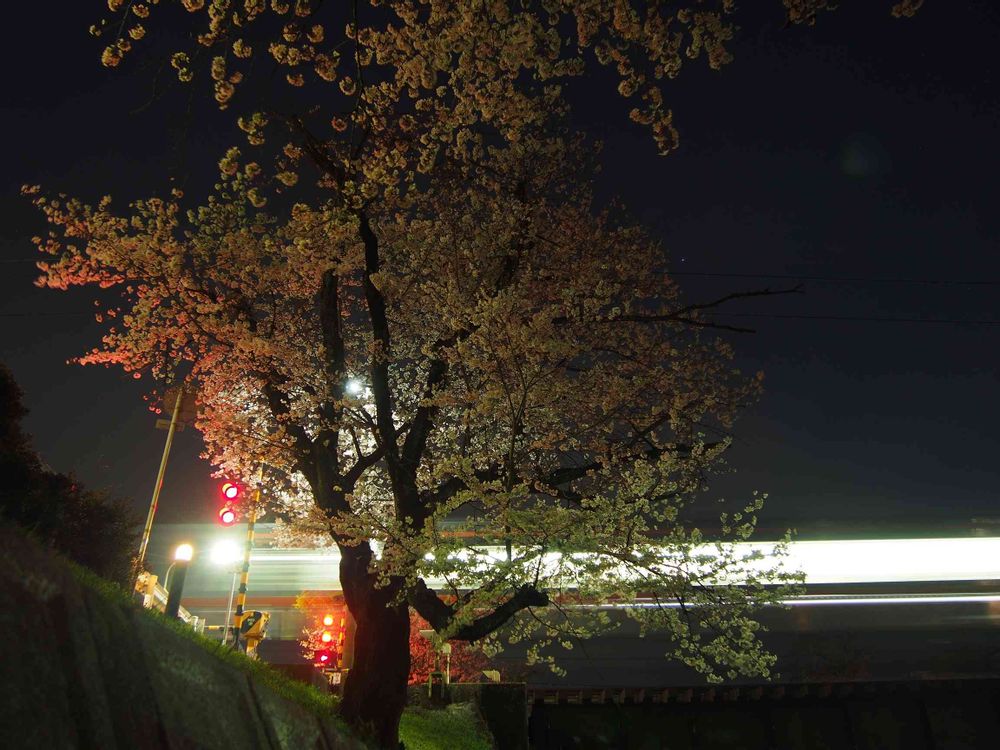 踏切の遮断機の赤で、桜も少しピンクに。
