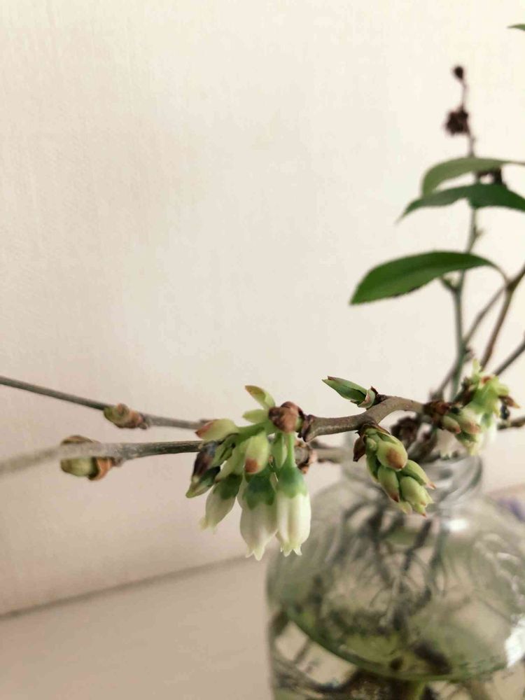庭のブルーベリーの剪定と挿木をしました。残った小枝の花芽が、暖かい部屋で蕾となり、花が咲きました!
