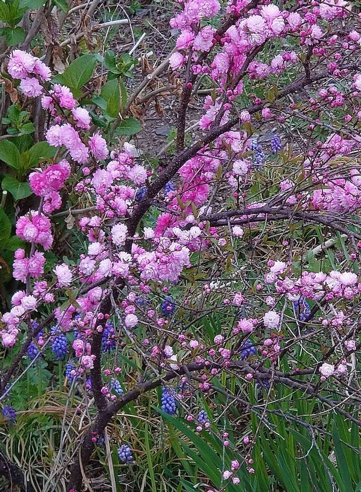 昨日の源平咲き枝垂れ花桃の近くに咲いていました😃根本にムスカリが咲いていて綺麗なコラボでした。