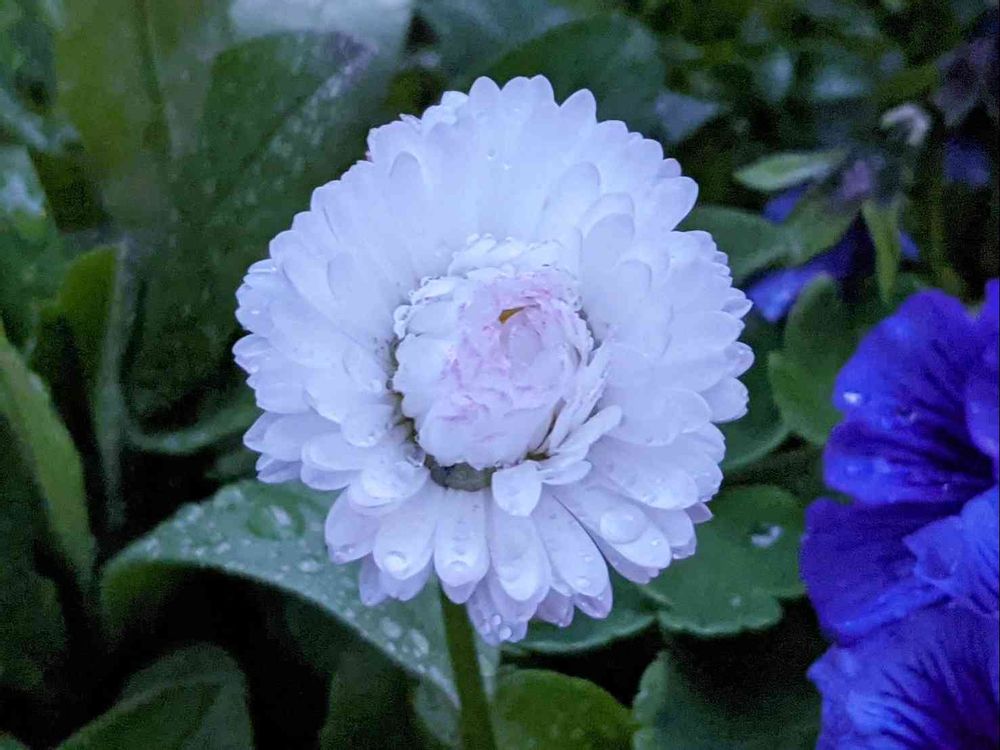 自治会から配って頂いた寄植えの中のデージー、真っ白かと思っていたのですが、あれっ真ん中にポッときれいなピンク色が…。