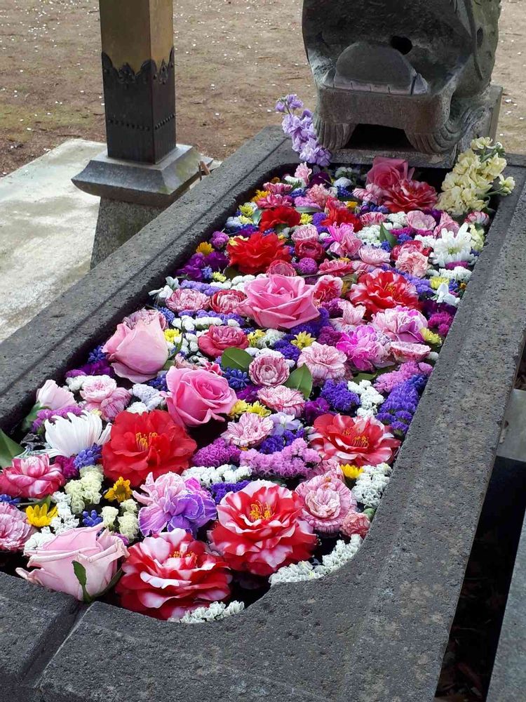 行方市西蓮寺。花手水鉢🏵🌹🌸💜椿、バラ、スターチスなど、色とりどりの花ꕤ…˖*華やかですね💗