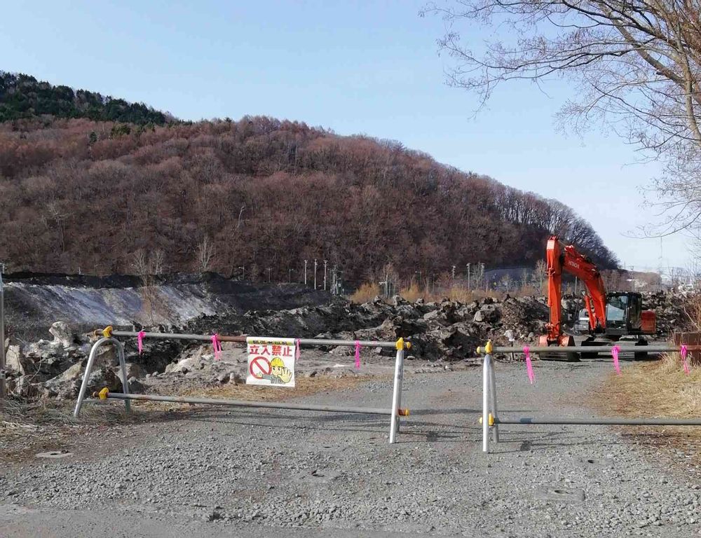 あれですよ。あれ!立ち入り禁止の柵から、重機までは普通の砂利道ですが、この黒い物体は雪なんです!