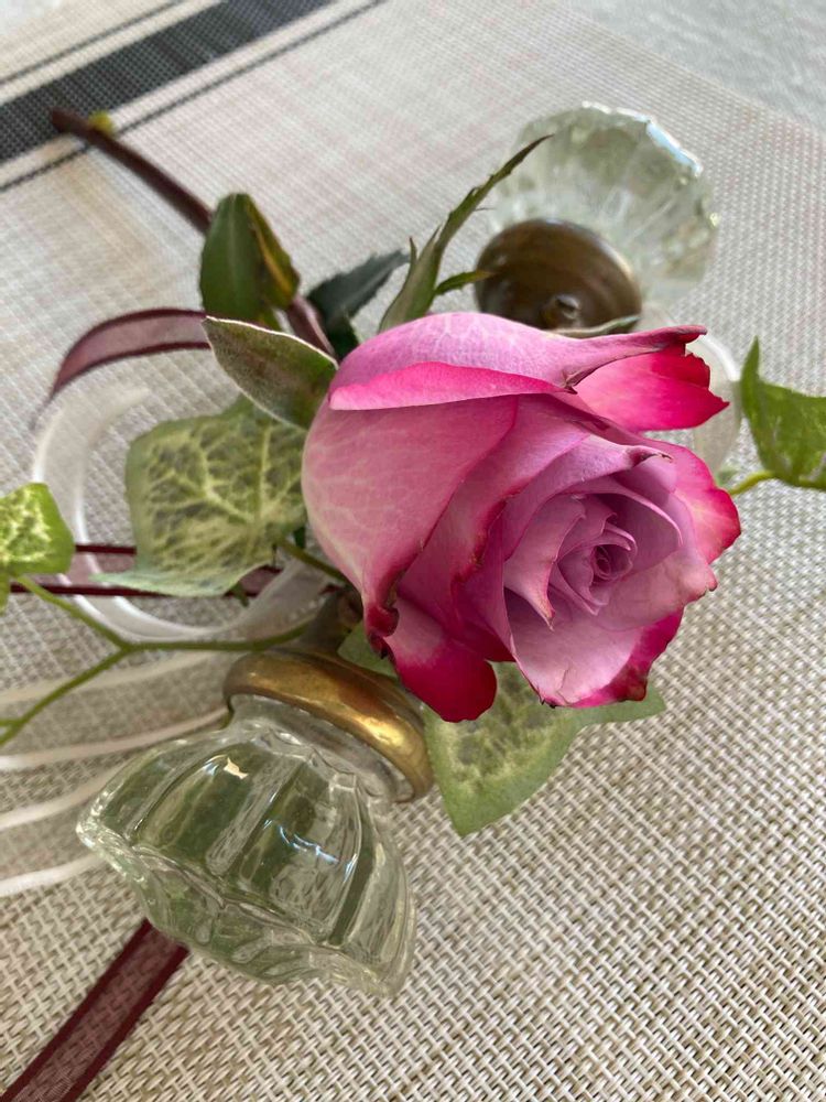 アンティークのガラスのドアノブと薔薇を飾ってみました。