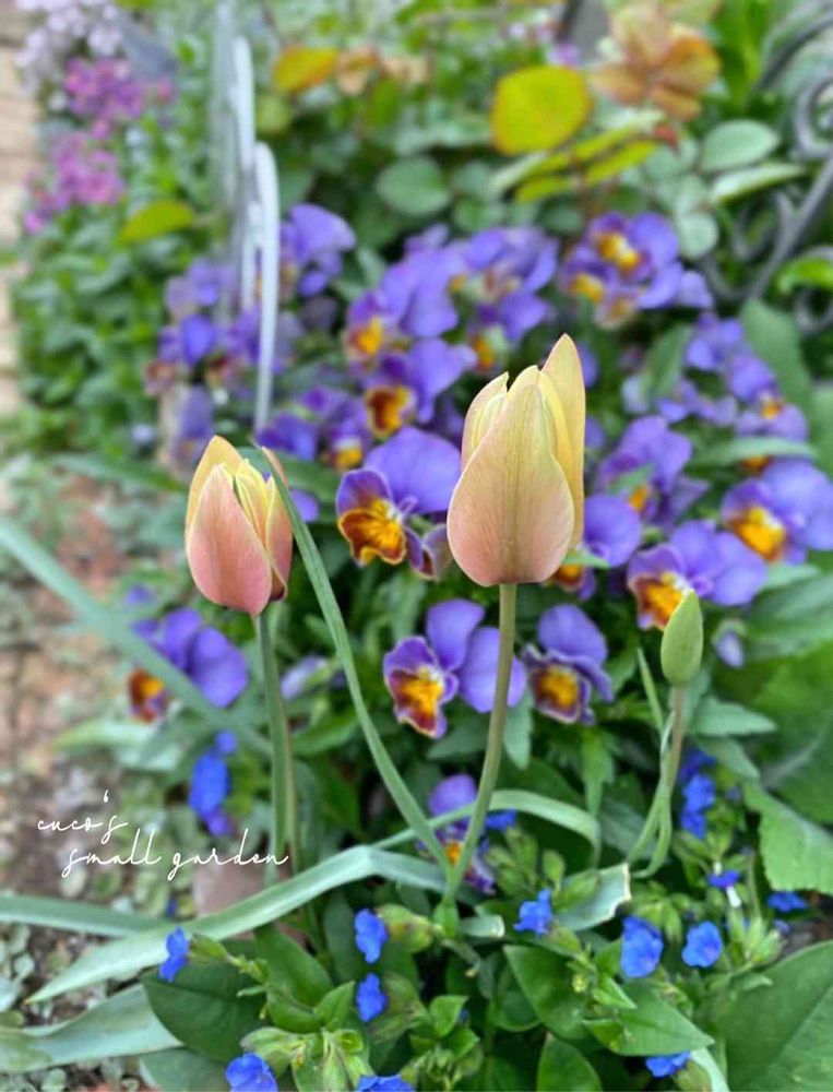 ここに、🌷が植わっていることも忘れ、ビオラやら植えちゃって、ただでさえ密な庭が、更に窮屈そうです(笑)でも、天然のコラボの美しい事♡