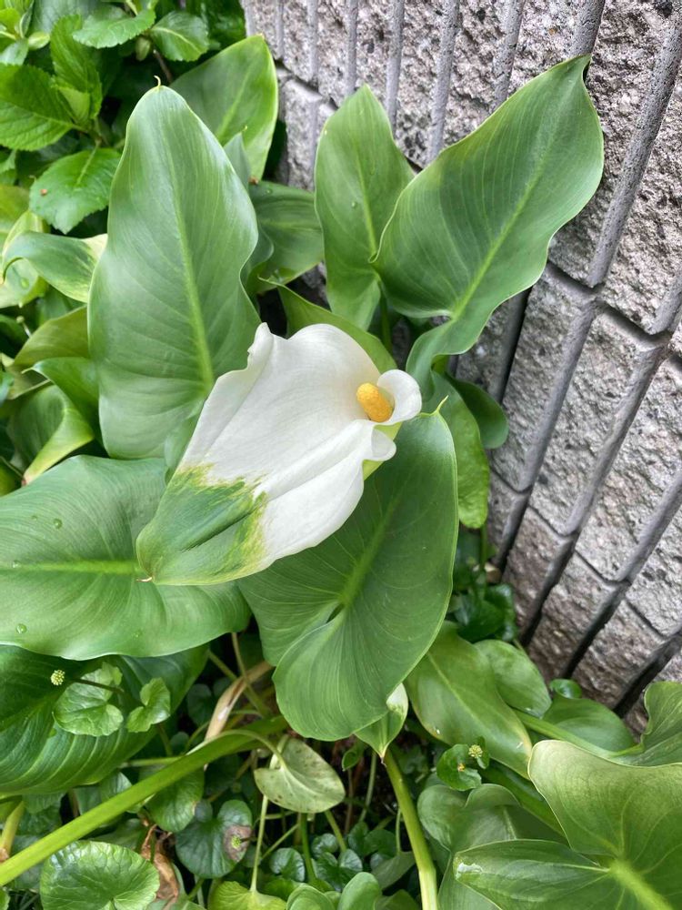 JR木幡駅近くのいつも撮影するポイントでカラーが咲いていました。葉の具合が独特なのですが、よくあるのでしょうか?