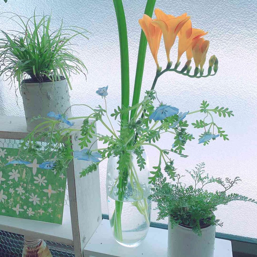 昨日の雨で倒れてしまったフリージアとネモフィラを切り花に❀.*・゚