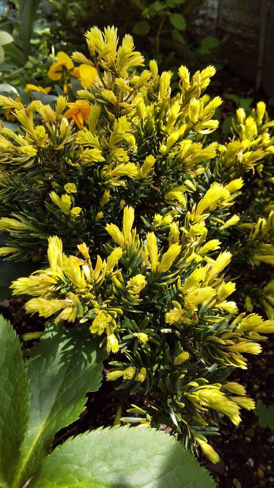 昨年、お迎えした「キンメキャラボク(金芽伽羅木)」の金芽が勢いよく出てきました。🌞