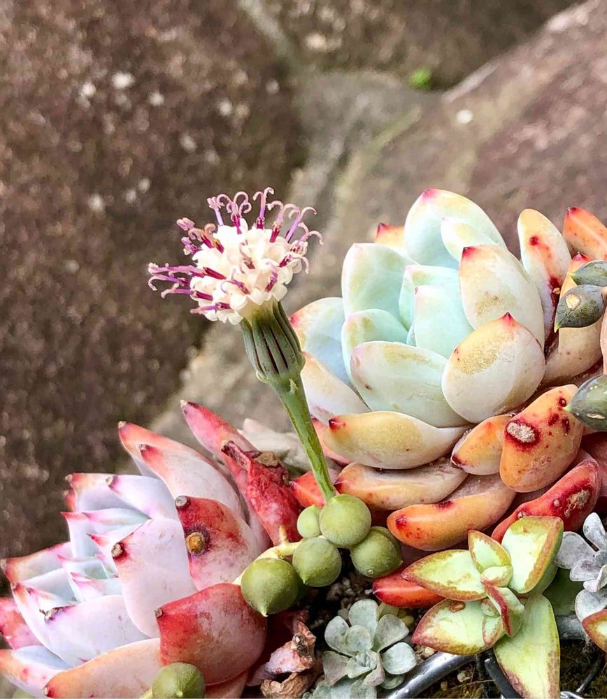 逞しく育った*ひろしまはなのわ*イザナミノミコト多肉のリースの間からポンポン花を咲かせています🌼