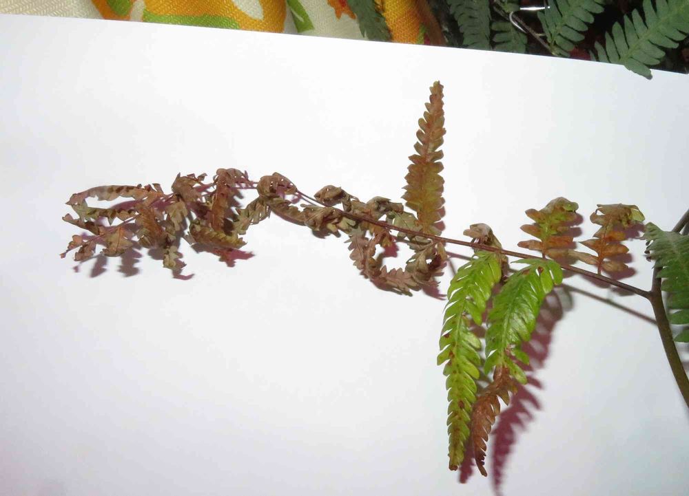 今回2枚目の写真です。この枝葉は2年存えてきたもので、そろそろ寿命のようです。まだ残りの2枚だけ生きてる葉っぱがあります。これは寿命なので育て方に問題があったわけではありません。うちでは、1枚でも残存する葉っぱがあったら、枯れ葉が目立っていても、基本的にはカットしていません。枝ごと完全に死んでからカットします。ここでいう枝とは、芯の太い枝ではなく、芯かから派生した細い横枝のことです。芯になってる枝は絶対に切らないようにしましょう。