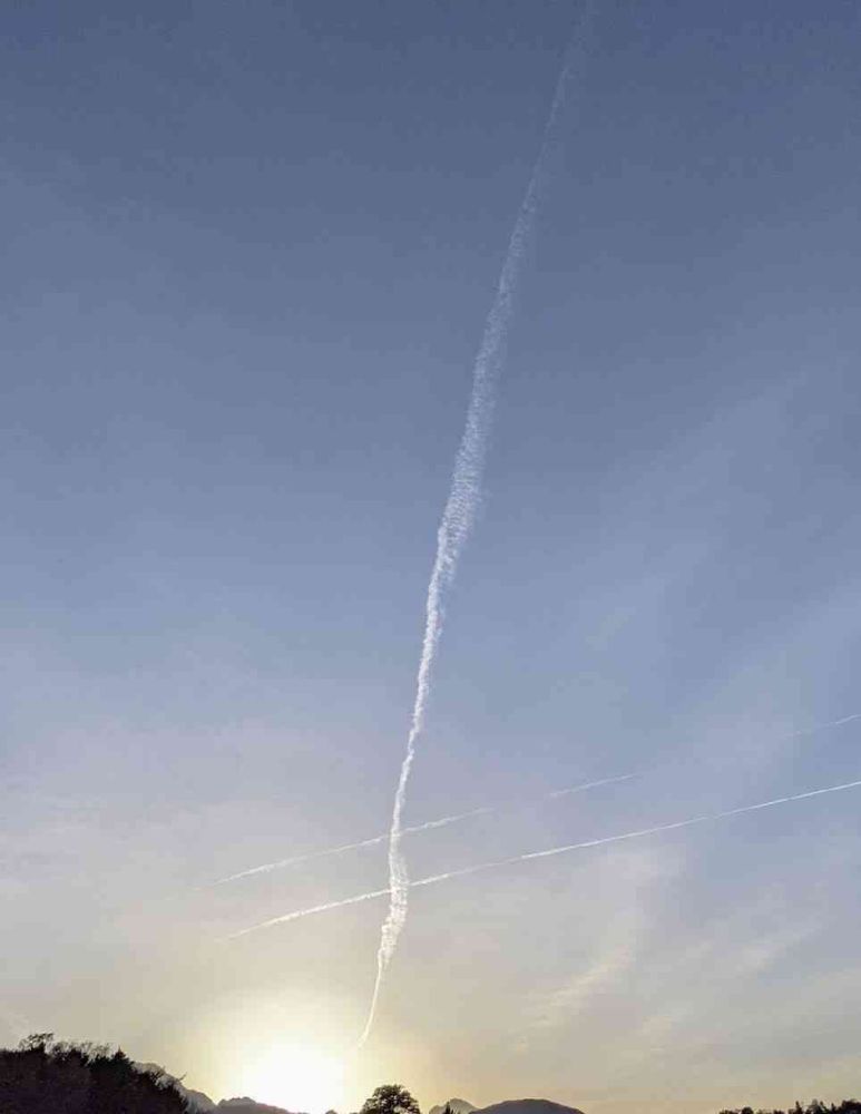 太陽に向かっている飛行機雲、夕方私も見ましたよ😊きっと同じ雲ですね❤️