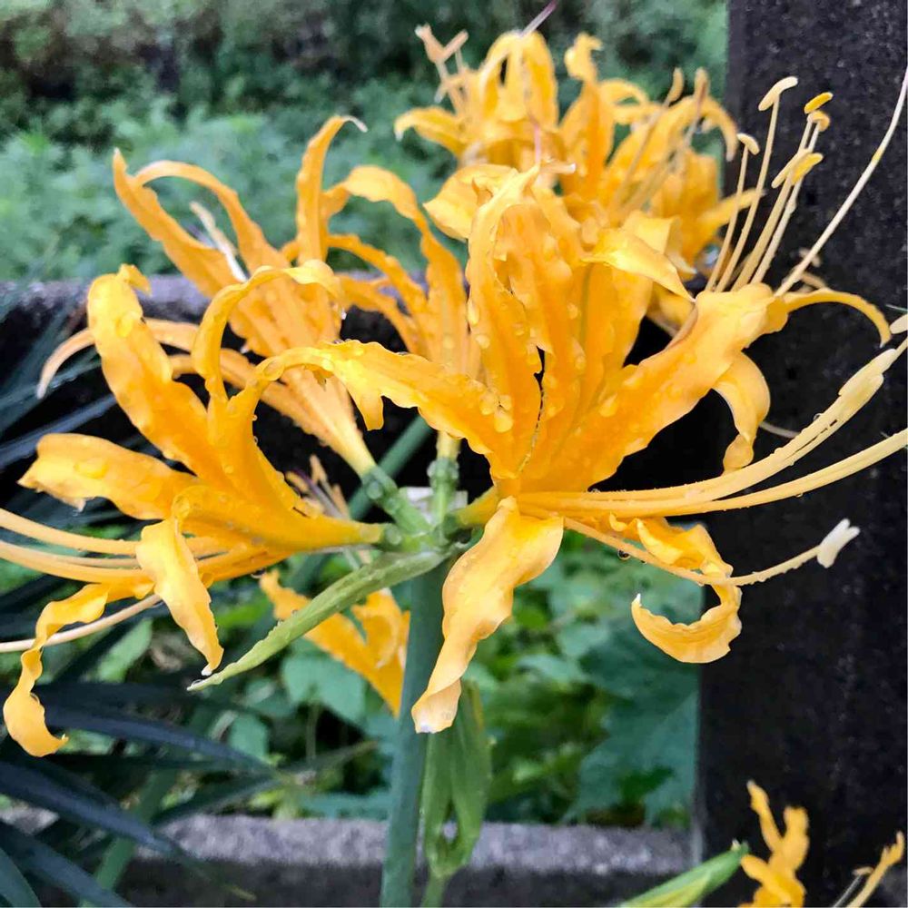 雨上がり、線路沿いの道端に咲いていた鮮やかな黄色の彼岸花。