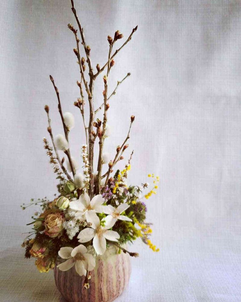 サクラの蕾やネコヤナギはドライですが、とても取れやすいので、乾燥させた後に接着剤で張り付けてありますよ。