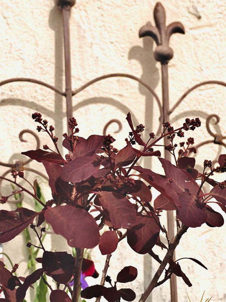 スモークツリーというと…煙りの木、モヤモヤとしたイメージでしたが、そうなる前の若い時期ですか?アンティークなカラーとフェンスがオシャレですね💐💕✨