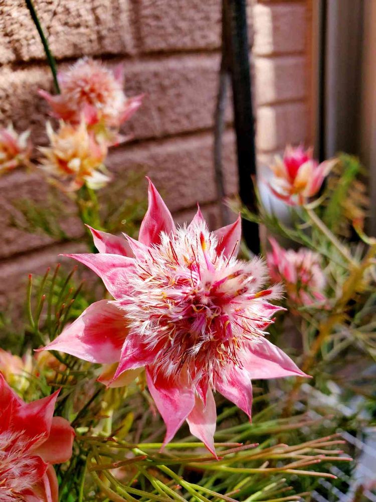 シルバーホワイトの綿毛に囲まれるピンク色の花です。