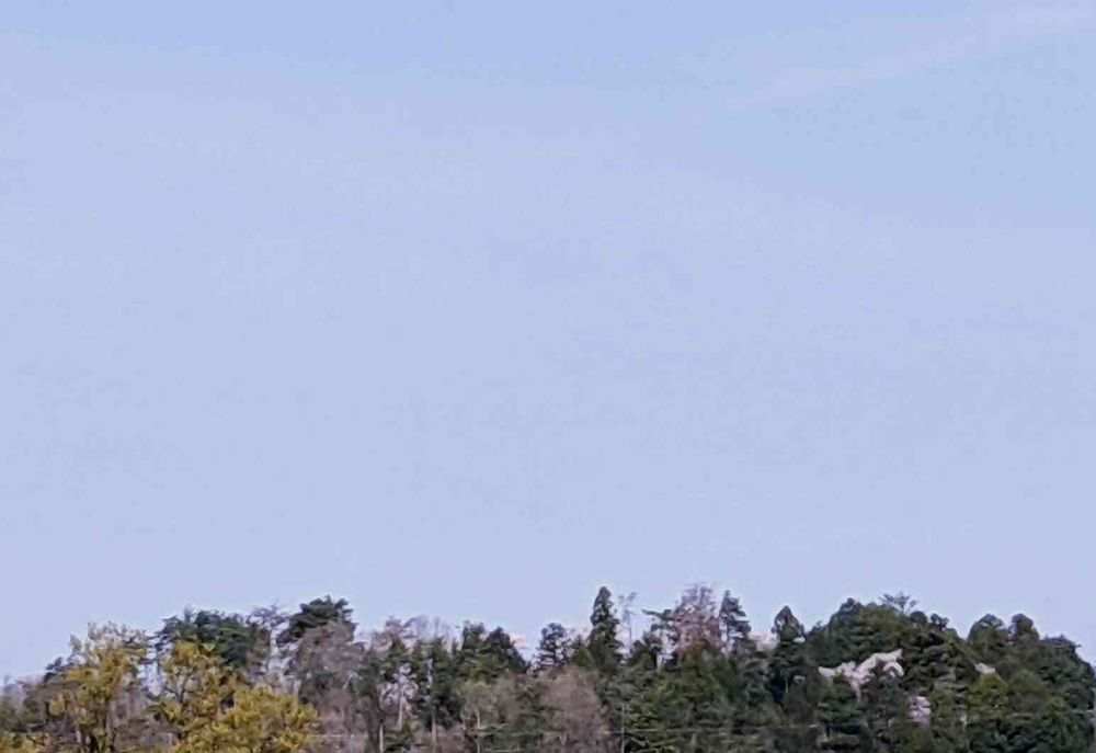 いつもの向こうの高台。穏やかな春の空の下、高台の木々の色合いの違いも見えています。右の方には満開の桜の木もあるようです。左の方にも…?🌲🌳🌲🌸🌸🌸
