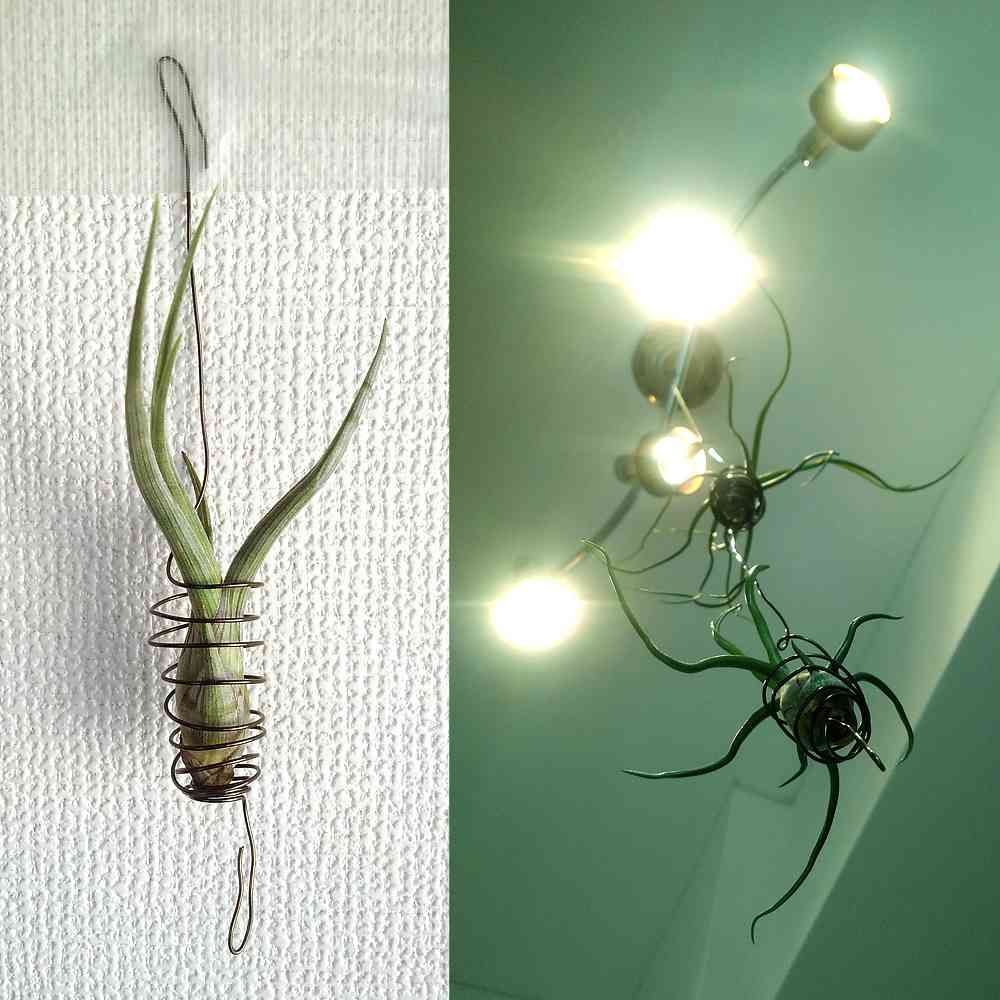 盆栽用のアルミ線(1.0mm)を使用。このアルミ線は家庭用のハサミで切断可能で、指先の力だけで容易く曲げることができる。筒状の物に巻いてコイル状に形成。上下をフック状にすることで縦に連結可能。ただし、重量級は1.0mmの強度では吊るせないかも。