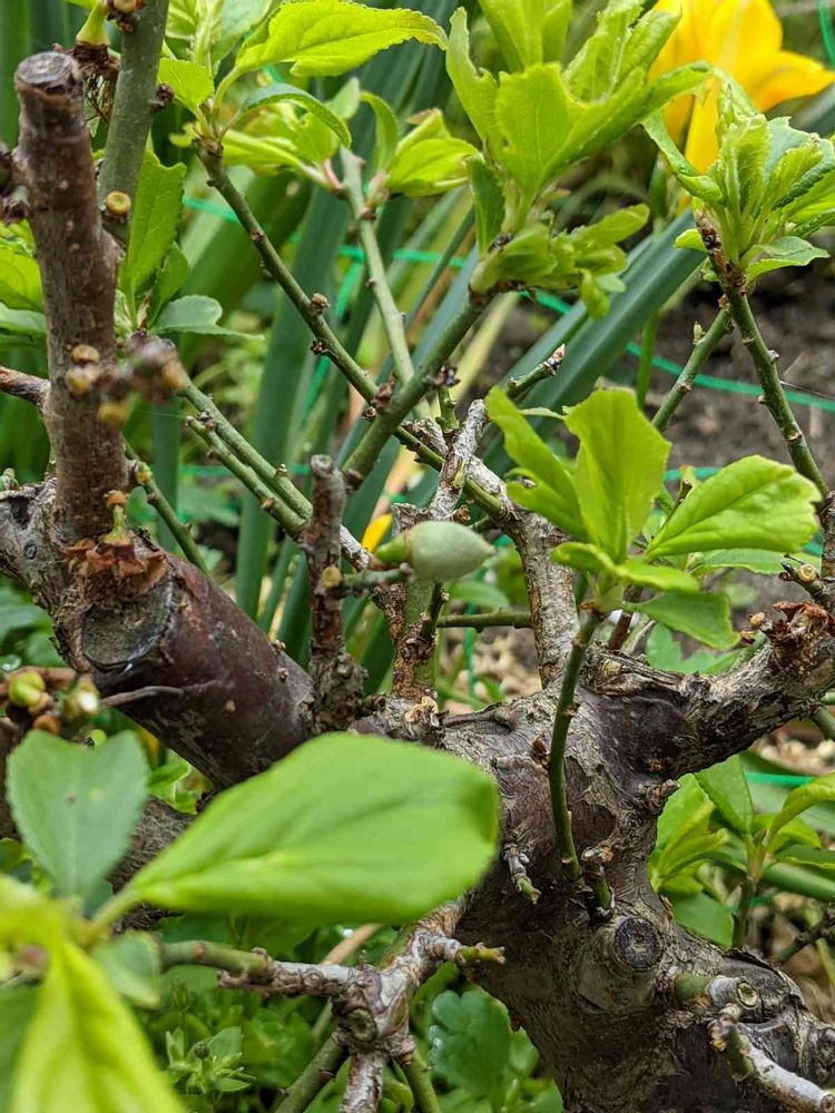 井戸端のささくれの気分発散に一役かった、盆栽の梅に実がついてるんでさぁ。