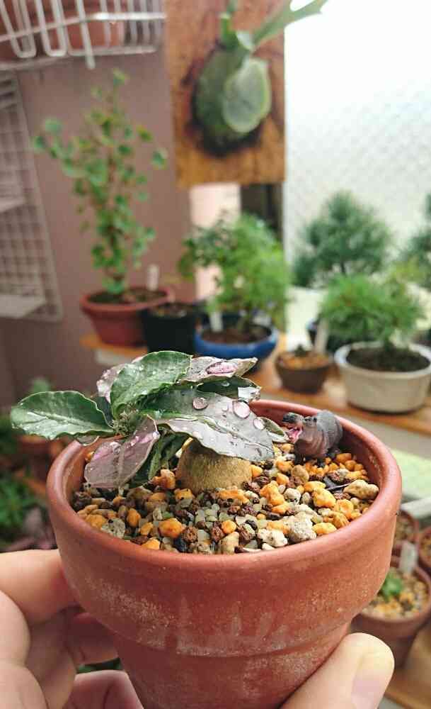 春からの成長で大きな葉がたくさん出てくれました。葉の紫色の粒々が水滴でくっきり見えます。イモも膨らんだかも。