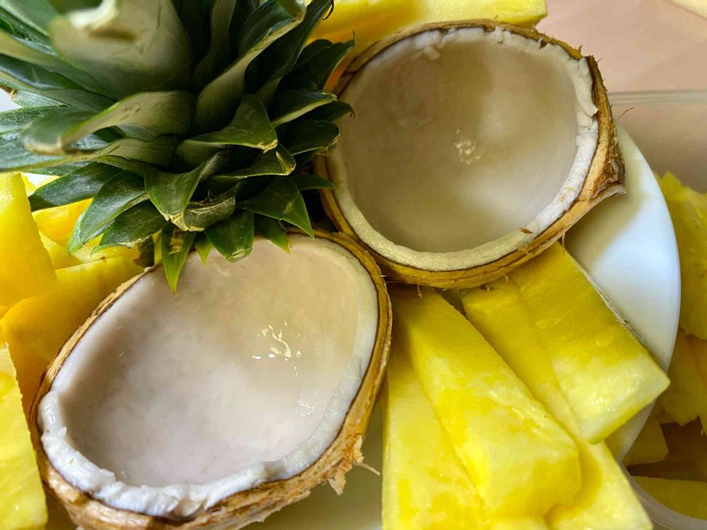 このココナッツは今までで一番ココナッツウォーターが濃くて美味しかった❣️パイナップルは薄めスティック状に切ると食べやすいです🤤