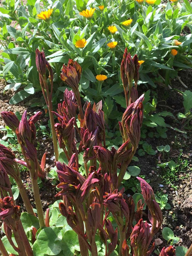 芍薬の芽が🌱急に伸びてきました。 間には 去年までは無かった ヒメリュウキンカが入り込んでいます。