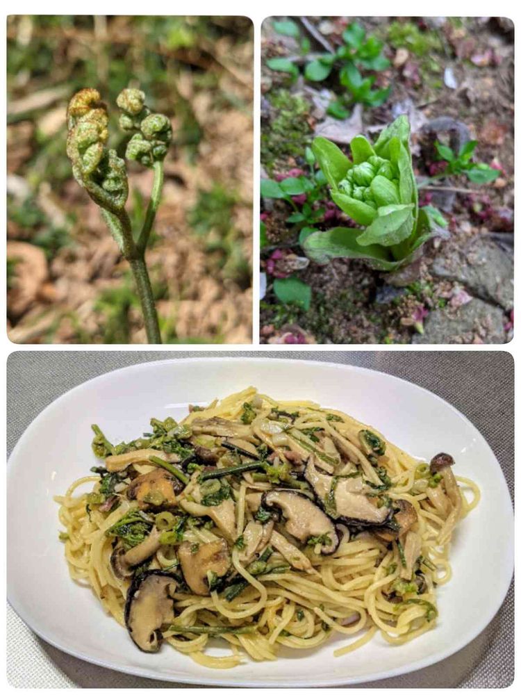 里山お散歩で摘んだワラビとフキノトウを使ってパスタ🍝を作りました♪
