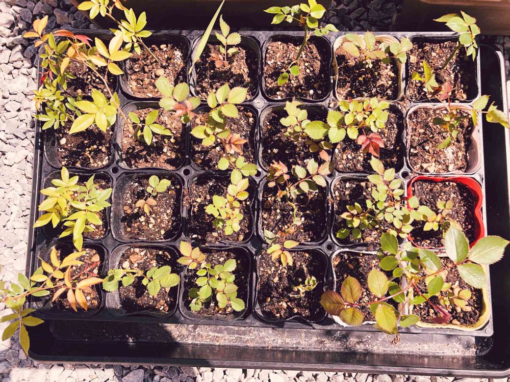 ミニバラの挿し芽が発根したのでポット植え替えしました♪花壇のミニバラコーナーにたくさん根付いてくれると嬉しいです😊