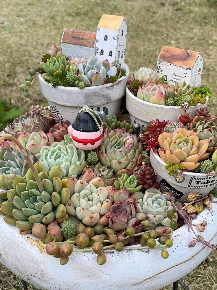 鉢にミニ鉢3つ乗せるアイデア、さらに豪華に見えますね🌱
