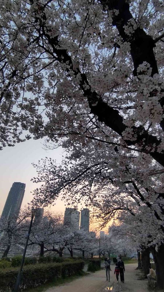 仕事帰りの大阪の大川沿いの桜です。ビルたちと夕陽と共に。
